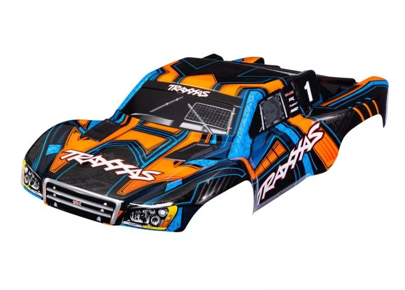 Slash 4x4 narancs/kék karosszéria matricákkal és TRAXXAS stoplikkal